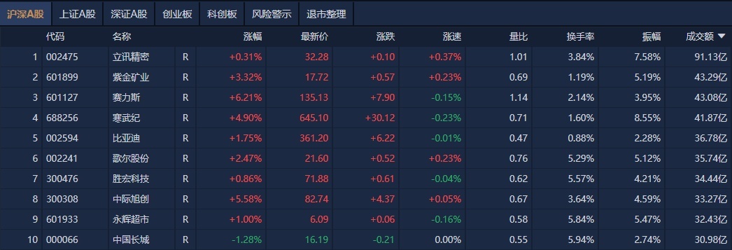 沪深两市半日成交额8388亿元,较上个交易日放量674亿。个股方面,立讯精密成交额超91亿元居首,紫金矿业、赛力斯、寒武纪成交额靠前。